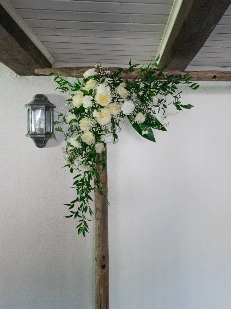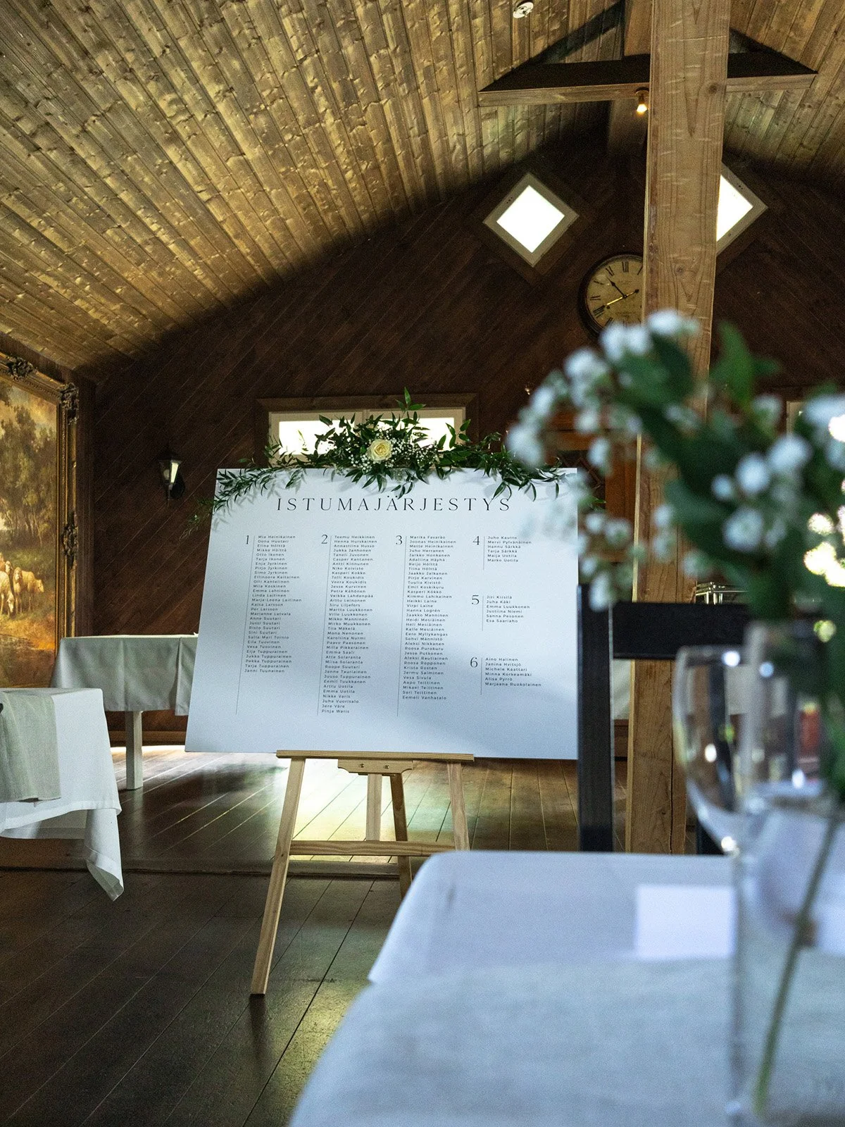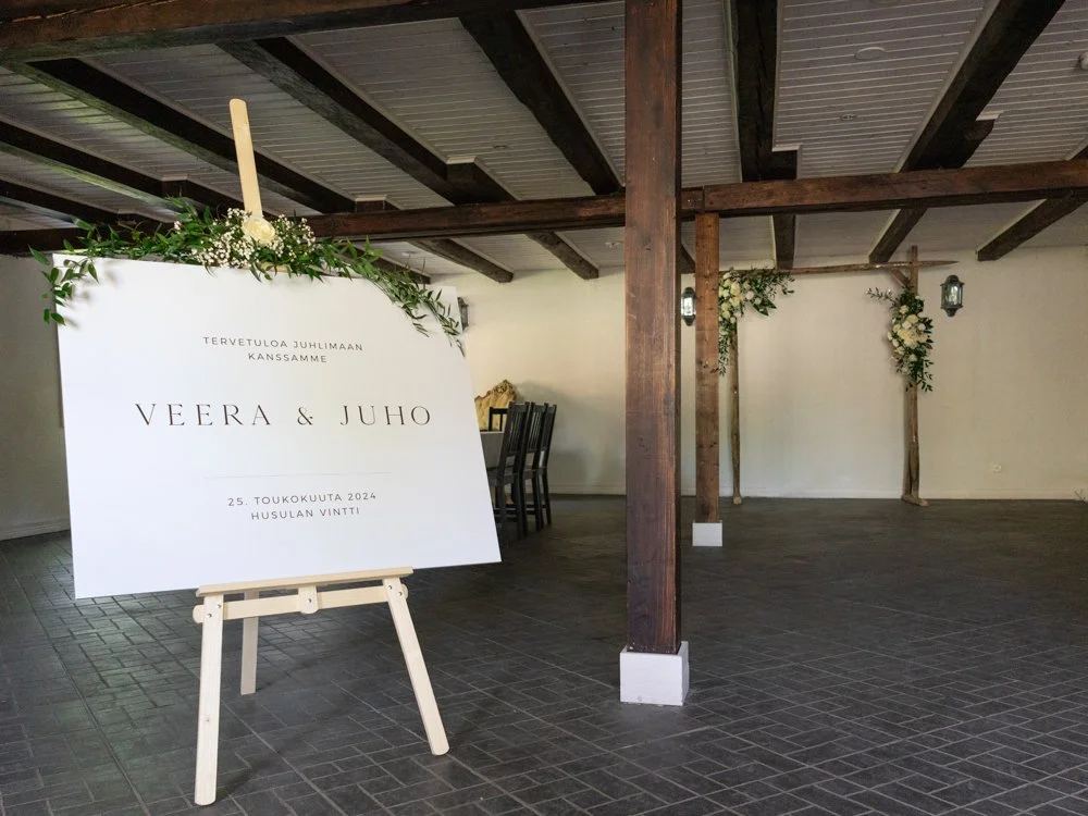 Kuvausseinä oli rakennettu Husulan Vintiltä valmiiksi löytyvään heinäseipäistä tehtyyn photobooth-seinän runkoon. Kauniit kukkalaitteet oli kiinnitetty kuvausseinän runkoon ja samantyyliset kukkakoristeet toistuivat myös hääkyltissä.