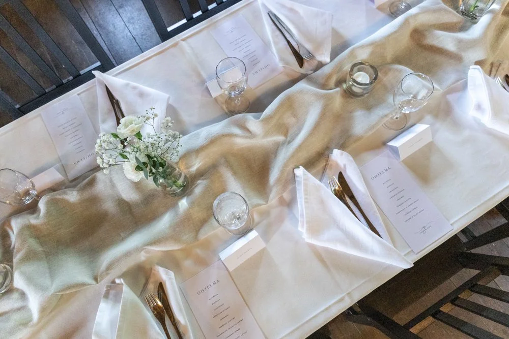 Alkukesän häihin luotiin tunnelmaa ajattomilla ja elganteilla hääkoristeilla. Vaaleat pöytäliinat ja luonnollinen kaitaliina boheemisti pöydälle asteltuna luovat kauniin pohjan muille koristeille. Valkoinen harsokukka ja neilikka ovat vuodesta toiseen suosittu ja elegantti valinta hääkukkiin. Inspiroidu alla olevista kuvista lisää.